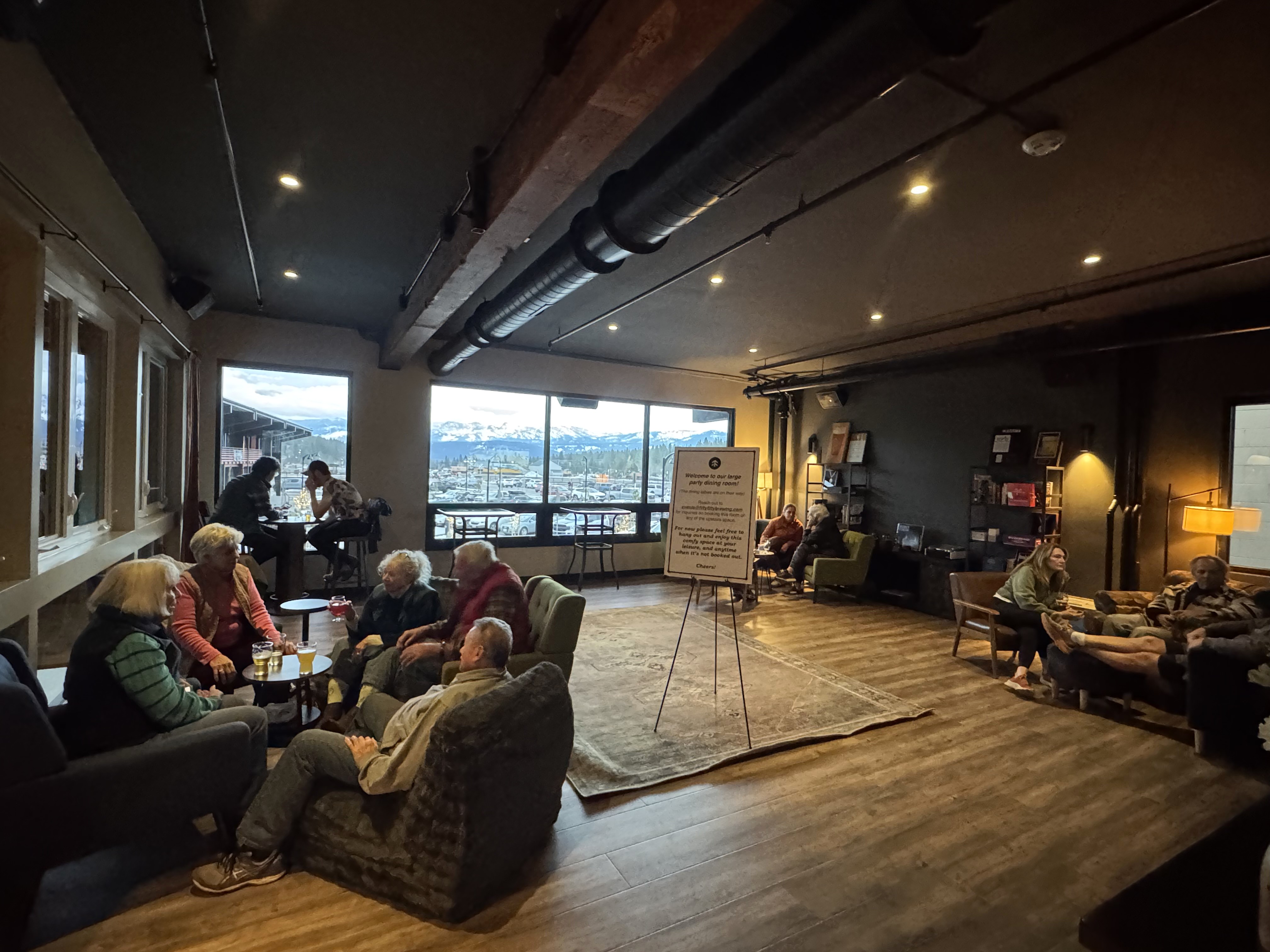 Tucked just beyond The Hideout, The Library serves as a quieter offshoot and can be  reserved as a private dining room for larger groups or intimate meetings. When not booked,  it functions as a calm retreat — a place to relax, listen to records, and take in sweeping  views of Mt. Rose and the Carson Range, and of course have a beer.
