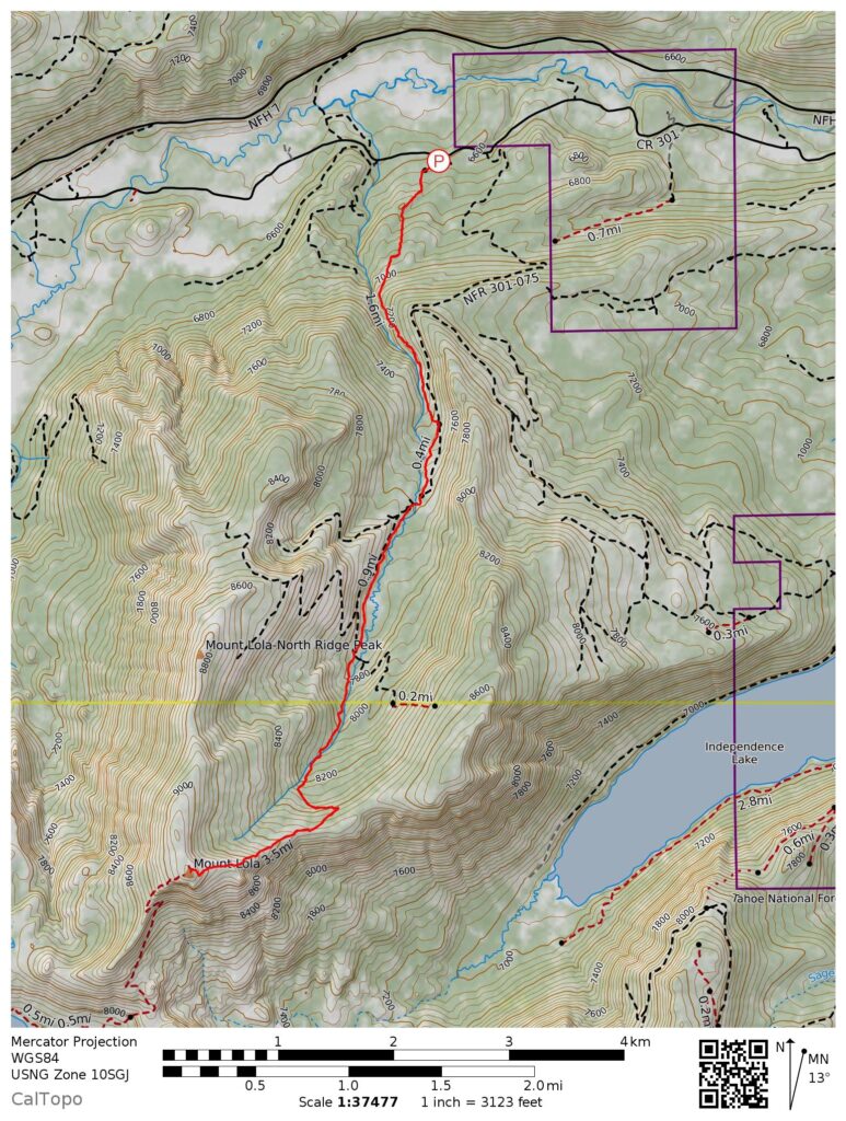 Take 89 north from Truckee for 14.5 miles, turning left onto USFS Road 07.  Drive for 1.5 miles to USFS Road 07-10, and follow this for 0.6 miles. Turn right on (unsigned) Henness Pass Road and drive for 3.1 miles to a road signed Mt Lola Trail.