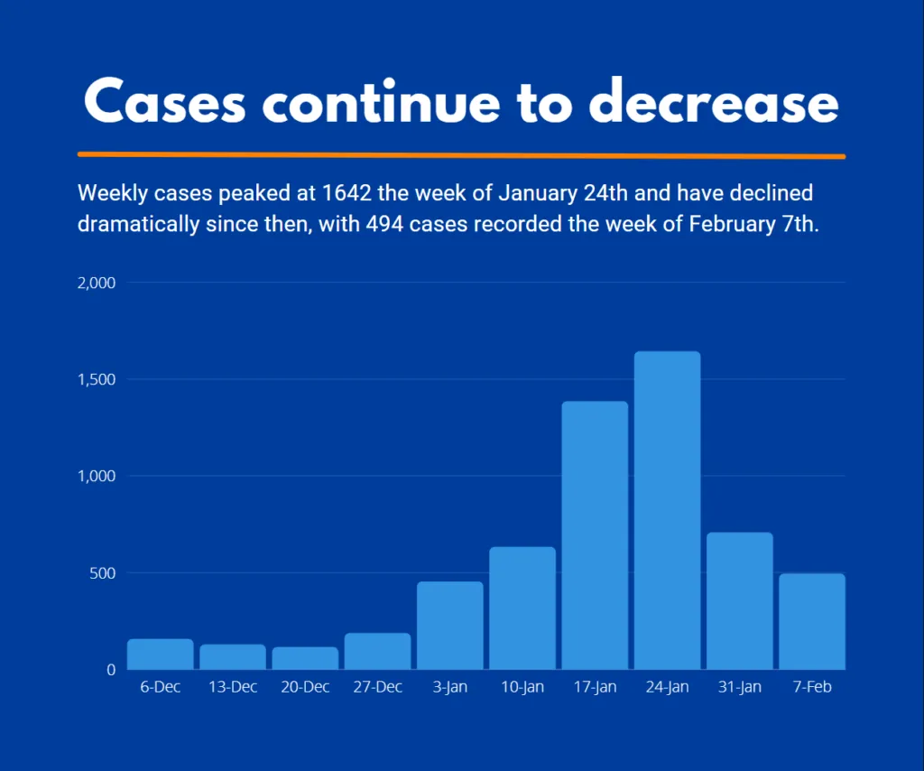 “Our local case rate is lower than statewide data, and we continue to see a sharp decrease in cases. However, we continue to have high transmission and should continue to take precautions until our case rate is considerably lower.”,” said Public Health Officer Dr. Sherilynn Cooke. “With the vaccine and high-quality masks available now, people can better protect themselves against COVID-19. We still strongly recommend getting vaccinated as it provides natural immunity that is broader than when someone gets infected.”