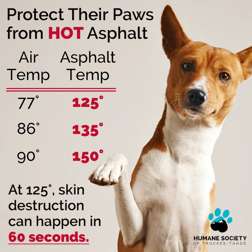 Summer temps are running hot this year. Be sure you watch out for your pup by exercising in the morning or evening when it's cooler. It can be surprising how hot asphalt temperatures can get! Even walking your dog downtown on the hot sidewalks during the day can be dangerous for your furry buddy. If you're out when it's hot, think about protective booties on the trails, sidewalks and roads to prevent severe burns. Your dog will thank you!
