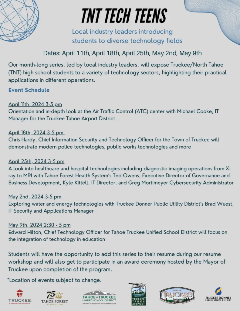 The Town of Truckee, Tahoe Truckee Unified School District, Truckee Donner Public Utility District, Tahoe Forest Hospital, Tahoe Truckee Airport District, and the Truckee Chamber of Commerce are excited to announce the launch of Truckee North Tahoe Tech Teens (TNT Tech Teens), a new workforce initiative focused on promoting the diverse range of tech-related jobs available to our Truckee and Tahoe students.