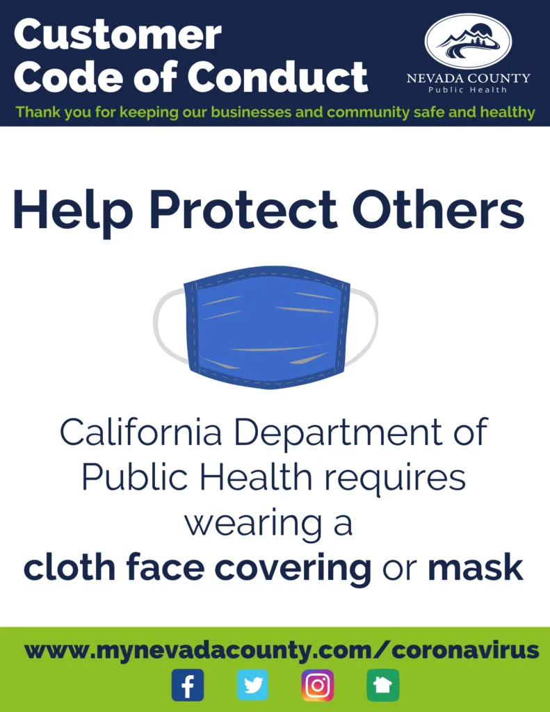 Wearing a face covering is just one way to help take care of Truckee’s mountain community and keep yourself and others safe. You never know who might have a pre-existing condition that puts them at risk for COVID-19. Just like wearing a seatbelt or washing your hands, it’s simply the right thing to do! Think about the employees who are hard at work to keep Truckee open for your visit, the vulnerability of our rural community, and your fellow travelers who wish to take home only memories of their great time in Truckee.