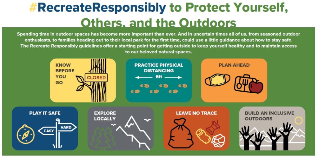 The Recreate Responsibly guidelines were created by the Recreate Responsibly Coalition of more than 1,000 businesses, agencies, nonprofits, and influential voices who are working together to help everyone experience the benefits of nature. #RecreateResponsibly