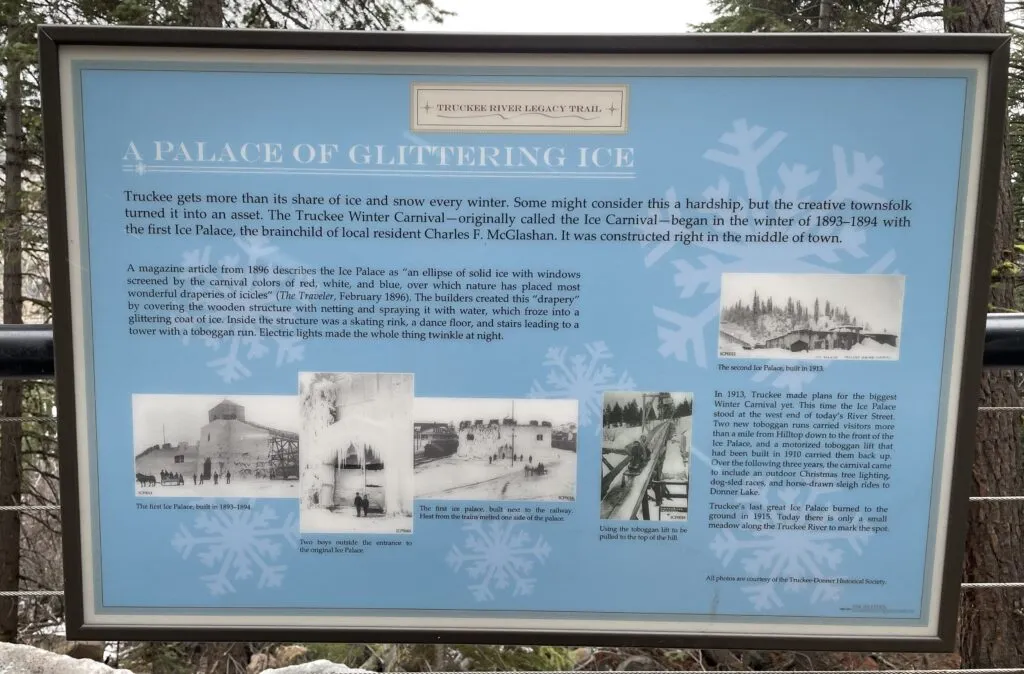 From there McGlashan decided that he needed to build an ice palace on Front Street (today’s Donner Pass Road). Ice palaces have existed elsewhere but Truckee’s ice palace was the first of its kind in the West. The goal was to make Truckee “the place to go to in the winter and spend time at.” McGlashan even patented his ice palace design.