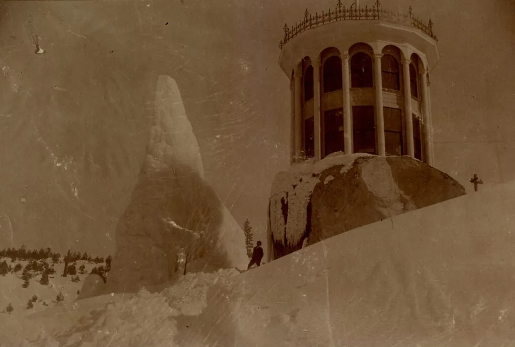 He started by building a giant inverted cone structure made of wood covered with wire netting that he sprayed with water on the hill above the town. When the temperatures plummeted, it formed a huge shimmering cone lit by an arc lamp. The ice cone dominated the Truckee skyline at the Rocking Stone and was visible from the train depot. The icicle did get people’s attention.